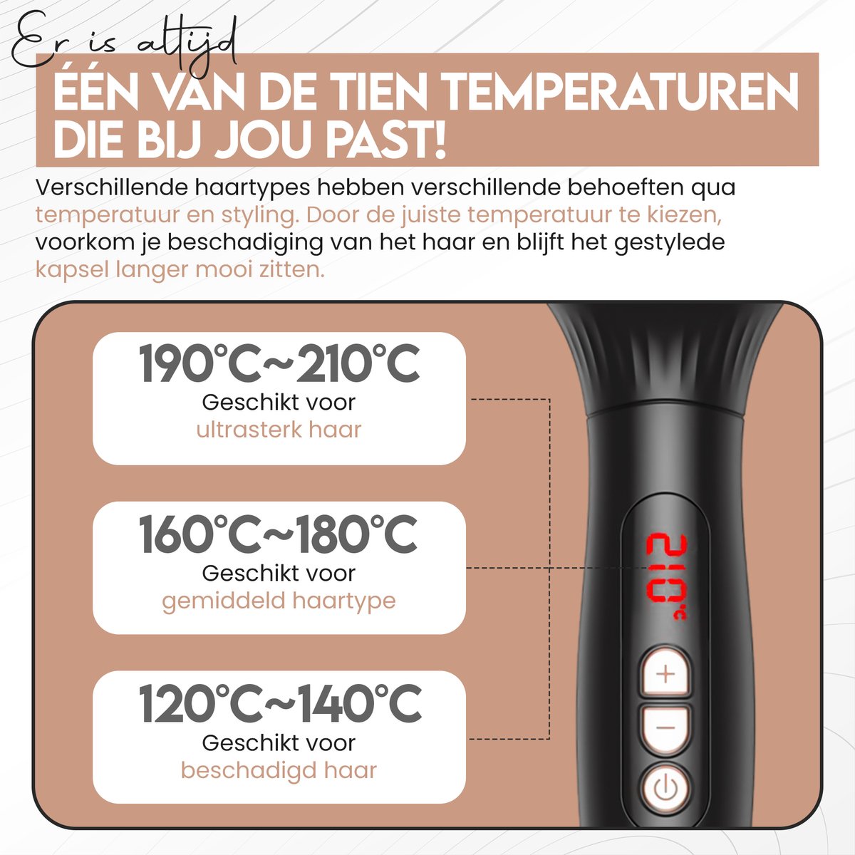 - 10 warmtestanden – selecteer de ideale temperatuur tussen 120°C en 210°C, afgestemd op jouw haartype, van kwetsbaar tot dik en weerbarstig haar.