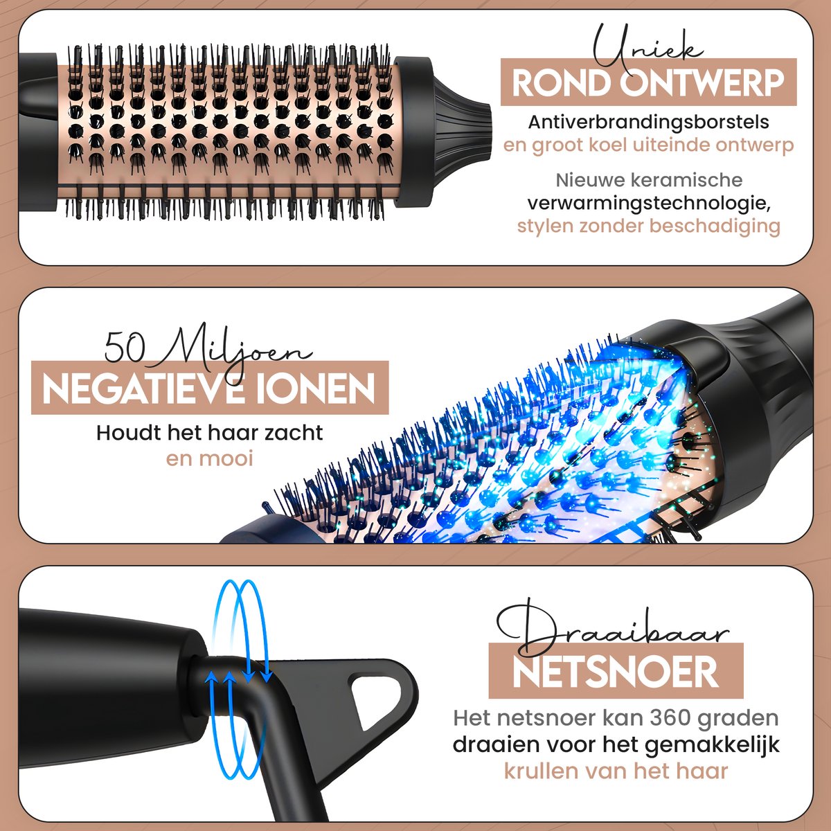 - Veilig en gebruiksvriendelijk – voorzien van een ant-verbrandingsontwerp, koude top en hittebestendige borstelpinnen voor optimaal comfort en veiligheid tijdens het stylen.